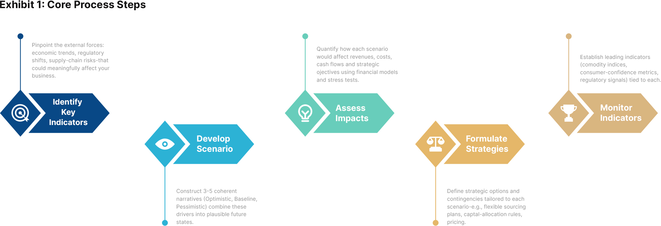 The process begins with clearly defining the focal issue—such as next year’s inventory needs—and setting a time horizon for analysis. Teams then identify the most critical factors that could influence outcomes, from raw‑material price swings to consumer‑confidence shifts, and select the few uncertainties with the greatest impact and ambiguity. They craft rich, qualitative storylines—“Demand Surge,” “Supply Disruption,” or “Regulatory Shift”—and pair these narratives with quantitative projections for revenue, costs, and cash flows. Finally, leadership rigorously tests existing strategies against each scenario, refines resource allocations, and creates explicit “if‑then” playbooks, deciding in advance that if raw‑material costs rise by twenty percent, secondary suppliers will be activated and pricing strategies adjusted accordingly.